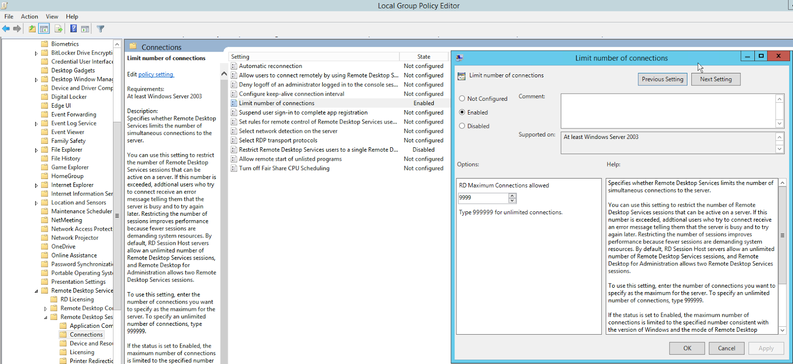 - zu: Computer Configuration > Administrative Templates > Windows Components > Remote Desktop Services > Remote Desktop Session Host > Connections gehen