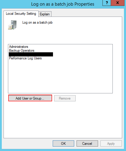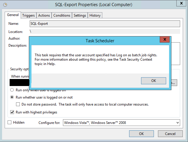 Task Scheduler: This task requires that the user account specified has Log on as batch job rights.